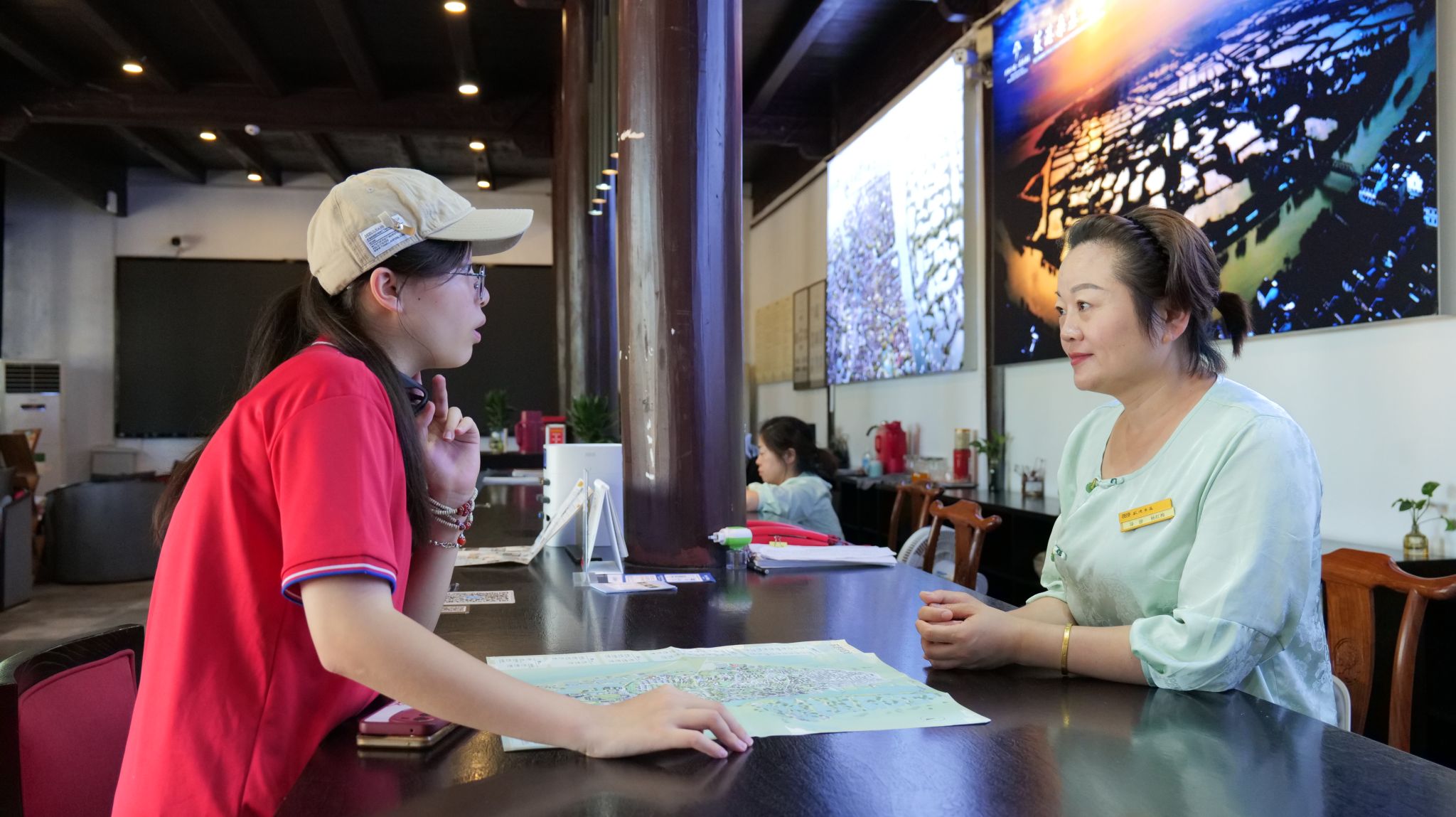 在荻港古村游客中心调研桑基鱼塘系统概况